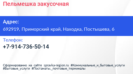 Пельмешка, закусочная по адресу 692919, Приморский край, Находка, Постышева, 6 в дальнейшем Организация, размещена в следующих категориях: