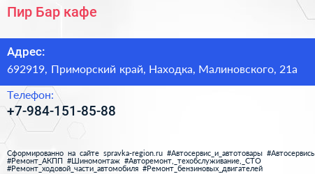 Пир Бар, кафе по адресу 692919, Приморский край, Находка, Малиновского, 21а в дальнейшем Организация, размещена в следующих категориях:
