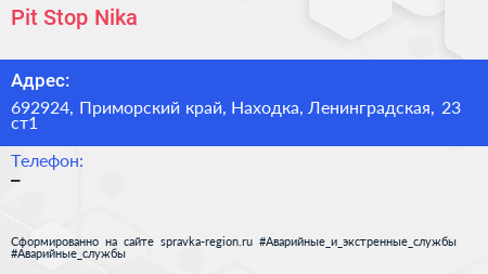 Pit-Stop Nika по адресу 692924, Приморский край, Находка, Ленинградская, 23 ст1 в дальнейшем Организация, размещена в следующих категориях: