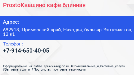 ProstoКвашино, кафе-блинная по адресу 692918, Приморский край, Находка, бульвар Энтузиастов, 12 к1 в дальнейшем Организация, размещена в следующих категориях: