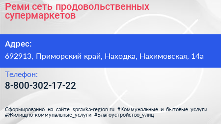 Реми, сеть продовольственных супермаркетов по адресу 692913, Приморский край, Находка, Нахимовская, 14а в дальнейшем Организация, размещена в следующих категориях: