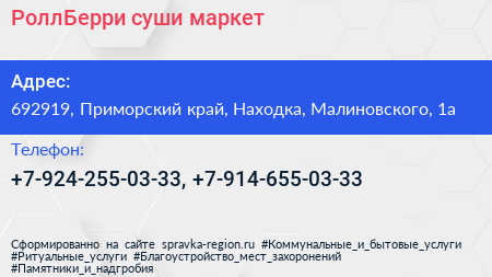 РоллБерри, суши-маркет по адресу 692919, Приморский край, Находка, Малиновского, 1а в дальнейшем Организация, размещена в следующих категориях: