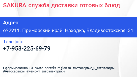 SAKURA, служба доставки готовых блюд по адресу 692911, Приморский край, Находка, Владивостокская, 31 в дальнейшем Организация, размещена в следующих категориях: