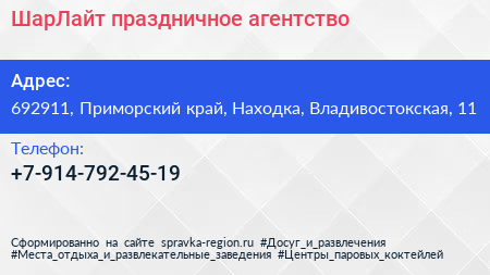 ШарЛайт, праздничное агентство по адресу 692911, Приморский край, Находка, Владивостокская, 11 в дальнейшем Организация, размещена в следующих категориях: