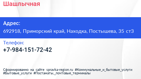 Шашлычная по адресу 692918, Приморский край, Находка, Постышева, 35 ст3 в дальнейшем Организация, размещена в следующих категориях: