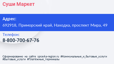 Суши-Маркет по адресу 692918, Приморский край, Находка, проспект Мира, 49 в дальнейшем Организация, размещена в следующих категориях: