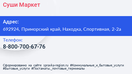 Суши-Маркет по адресу 692924, Приморский край, Находка, Спортивная, 2-2а в дальнейшем Организация, размещена в следующих категориях: