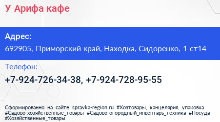 У Арифа, кафе по адресу 692905, Приморский край, Находка, Сидоренко, 1 ст14 в дальнейшем Организация, размещена в следующих категориях: