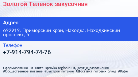 Золотой Теленок, закусочная по адресу 692919, Приморский край, Находка, Находкинский проспект, 5 в дальнейшем Организация, размещена в следующих категориях: