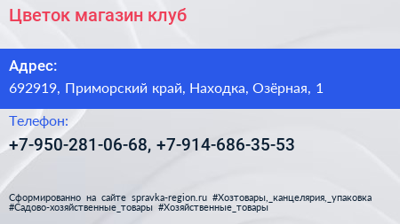 Цветок, магазин-клуб по адресу 692919, Приморский край, Находка, Озёрная, 1 в дальнейшем Организация, размещена в следующих категориях: