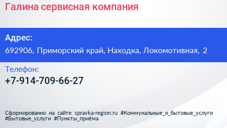 Галина, сервисная компания по адресу 692906, Приморский край, Находка, Локомотивная, 2 в дальнейшем Организация, размещена в следующих категориях: