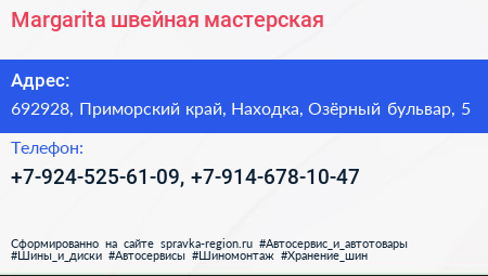 Margarita, швейная мастерская по адресу 692928, Приморский край, Находка, Озёрный бульвар, 5 в дальнейшем Организация, размещена в следующих категориях: