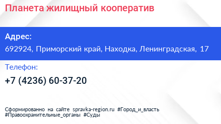 Планета, жилищный кооператив по адресу 692924, Приморский край, Находка, Ленинградская, 17 в дальнейшем Организация, размещена в следующих категориях: