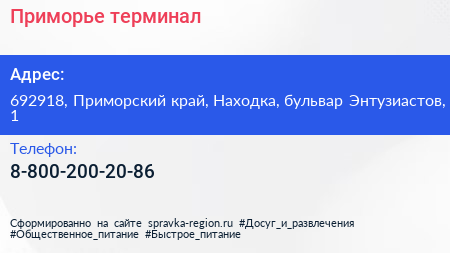 Приморье, терминал по адресу 692918, Приморский край, Находка, бульвар Энтузиастов, 1 в дальнейшем Организация, размещена в следующих категориях: