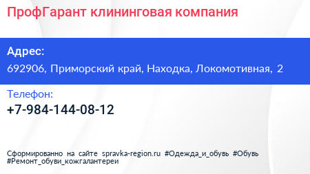 ПрофГарант, клининговая компания по адресу 692906, Приморский край, Находка, Локомотивная, 2 в дальнейшем Организация, размещена в следующих категориях: