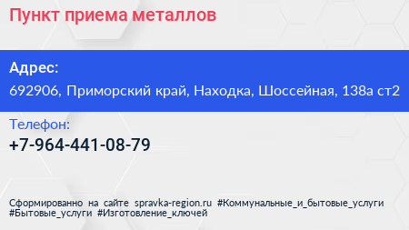 Пункт приема металлов по адресу 692906, Приморский край, Находка, Шоссейная, 138а ст2 в дальнейшем Организация, размещена в следующих категориях: