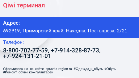 Qiwi, терминал по адресу 692919, Приморский край, Находка, Постышева, 2/21 в дальнейшем Организация, размещена в следующих категориях: