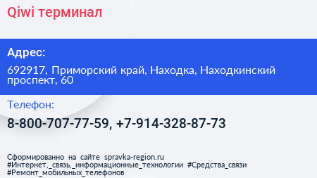 Qiwi, терминал по адресу 692917, Приморский край, Находка, Находкинский проспект, 60 в дальнейшем Организация, размещена в следующих категориях: