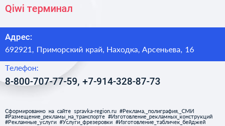 Qiwi, терминал по адресу 692921, Приморский край, Находка, Арсеньева, 16 в дальнейшем Организация, размещена в следующих категориях: