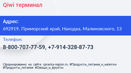 Qiwi, терминал по адресу 692919, Приморский край, Находка, Малиновского, 13 в дальнейшем Организация, размещена в следующих категориях: