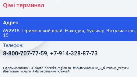 Qiwi, терминал по адресу 692918, Приморский край, Находка, бульвар Энтузиастов, 15 в дальнейшем Организация, размещена в следующих категориях: