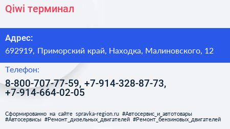 Qiwi, терминал по адресу 692919, Приморский край, Находка, Малиновского, 12 в дальнейшем Организация, размещена в следующих категориях: