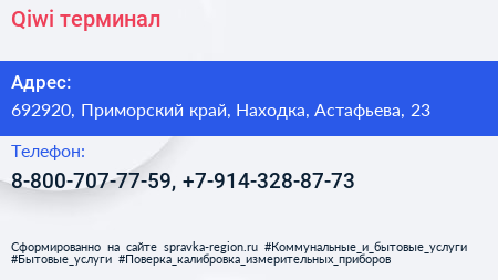 Qiwi, терминал по адресу 692920, Приморский край, Находка, Астафьева, 23 в дальнейшем Организация, размещена в следующих категориях: