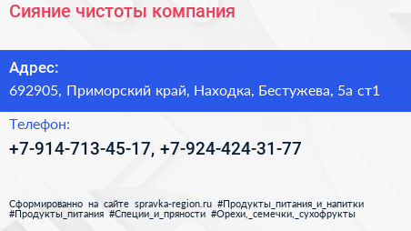 Сияние чистоты, компания по адресу 692905, Приморский край, Находка, Бестужева, 5а ст1 в дальнейшем Организация, размещена в следующих категориях: