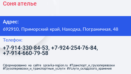 Соня, ателье по адресу 692910, Приморский край, Находка, Пограничная, 48 в дальнейшем Организация, размещена в следующих категориях: