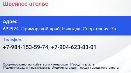 Швейное ателье по адресу 692924, Приморский край, Находка, Спортивная, 7в в дальнейшем Организация, размещена в следующих категориях: