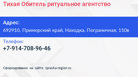 Тихая Обитель, ритуальное агентство по адресу 692910, Приморский край, Находка, Пограничная, 110в в дальнейшем Организация, размещена в следующих категориях: