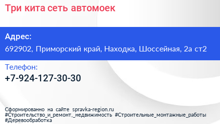 Три кита, сеть автомоек по адресу 692902, Приморский край, Находка, Шоссейная, 2а ст2 в дальнейшем Организация, размещена в следующих категориях: