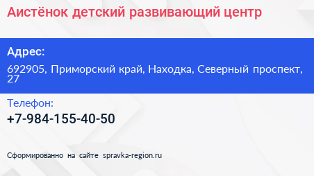 Аистёнок, детский развивающий центр по адресу 692905, Приморский край, Находка, Северный проспект, 27 в дальнейшем Организация, размещена в следующих категориях: