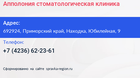 Апполония, стоматологическая клиника по адресу 692924, Приморский край, Находка, Юбилейная, 9 в дальнейшем Организация, размещена в следующих категориях: