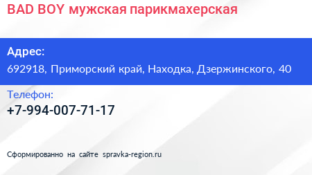 BAD BOY, мужская парикмахерская по адресу 692918, Приморский край, Находка, Дзержинского, 40 в дальнейшем Организация, размещена в следующих категориях: