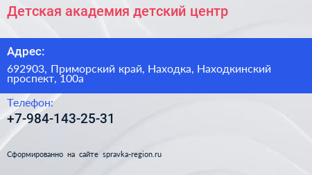 Детская академия, детский центр по адресу 692903, Приморский край, Находка, Находкинский проспект, 100а в дальнейшем Организация, размещена в следующих категориях: