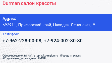 Durman, салон красоты по адресу 692911, Приморский край, Находка, Ленинская, 9 в дальнейшем Организация, размещена в следующих категориях: