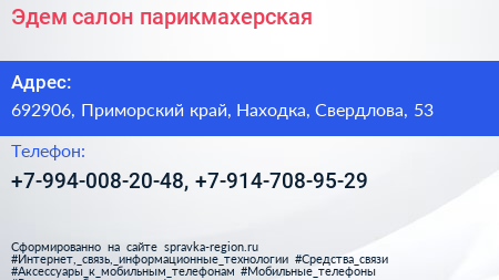 Эдем, салон-парикмахерская по адресу 692906, Приморский край, Находка, Свердлова, 53 в дальнейшем Организация, размещена в следующих категориях: