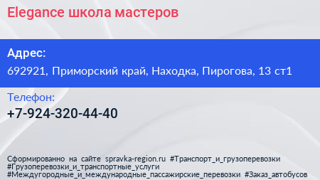 Elegance, школа мастеров по адресу 692921, Приморский край, Находка, Пирогова, 13 ст1 в дальнейшем Организация, размещена в следующих категориях: