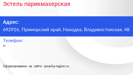 Эстель, парикмахерская по адресу 692916, Приморский край, Находка, Владивостокская, 48 в дальнейшем Организация, размещена в следующих категориях: