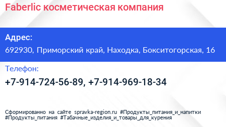 Faberlic, косметическая компания по адресу 692930, Приморский край, Находка, Бокситогорская, 16 в дальнейшем Организация, размещена в следующих категориях: