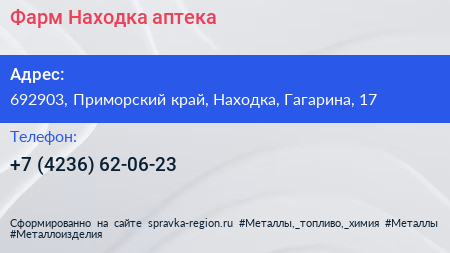 Фарм-Находка, аптека по адресу 692903, Приморский край, Находка, Гагарина, 17 в дальнейшем Организация, размещена в следующих категориях: