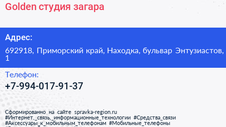 Golden, студия загара по адресу 692918, Приморский край, Находка, бульвар Энтузиастов, 1 в дальнейшем Организация, размещена в следующих категориях: