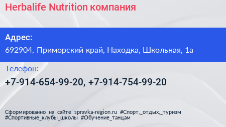 Herbalife Nutrition, компания по адресу 692904, Приморский край, Находка, Школьная, 1а в дальнейшем Организация, размещена в следующих категориях: