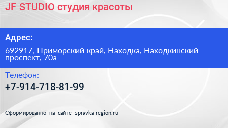 JF STUDIO, студия красоты по адресу 692917, Приморский край, Находка, Находкинский проспект, 70а в дальнейшем Организация, размещена в следующих категориях: