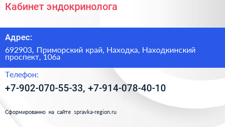 Кабинет эндокринолога по адресу 692903, Приморский край, Находка, Находкинский проспект, 106а в дальнейшем Организация, размещена в следующих категориях: