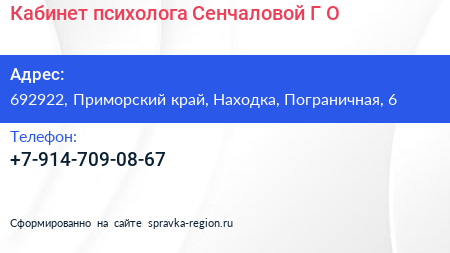 Кабинет психолога Сенчаловой Г.О. по адресу 692922, Приморский край, Находка, Пограничная, 6 в дальнейшем Организация, размещена в следующих категориях: