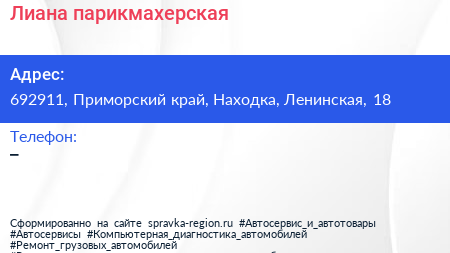 Лиана, парикмахерская по адресу 692911, Приморский край, Находка, Ленинская, 18 в дальнейшем Организация, размещена в следующих категориях: