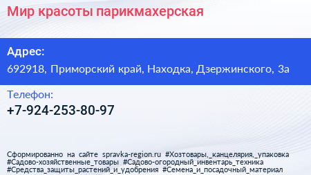 Мир красоты, парикмахерская по адресу 692918, Приморский край, Находка, Дзержинского, 3а в дальнейшем Организация, размещена в следующих категориях: