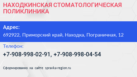 НАХОДКИНСКАЯ СТОМАТОЛОГИЧЕСКАЯ ПОЛИКЛИНИКА по адресу 692922, Приморский край, Находка, Пограничная, 12 в дальнейшем Организация, размещена в следующих категориях: